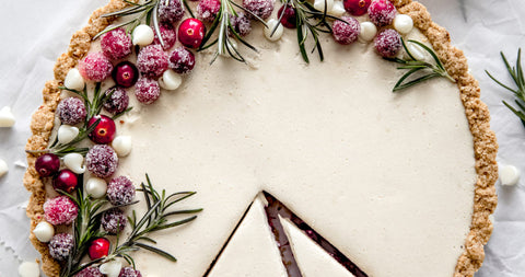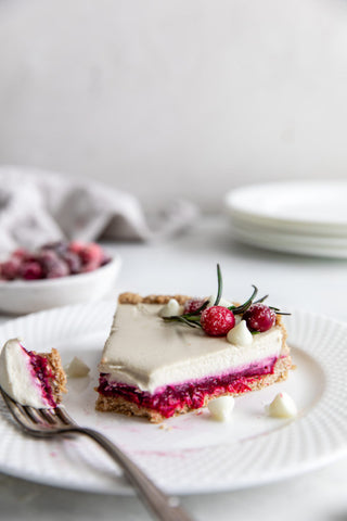 - In a food processor or high speed blender add cashews, maple syrup, coconut milk and cashew pulp. Process until completely smooth. Add melted chocolate/cacao butter and process until combined. Pour white chocolate mixture into the tart and let set in the refrigerator for about 2-3 hours. Garnish with cranberries and white chocolate chips and serve immediately.